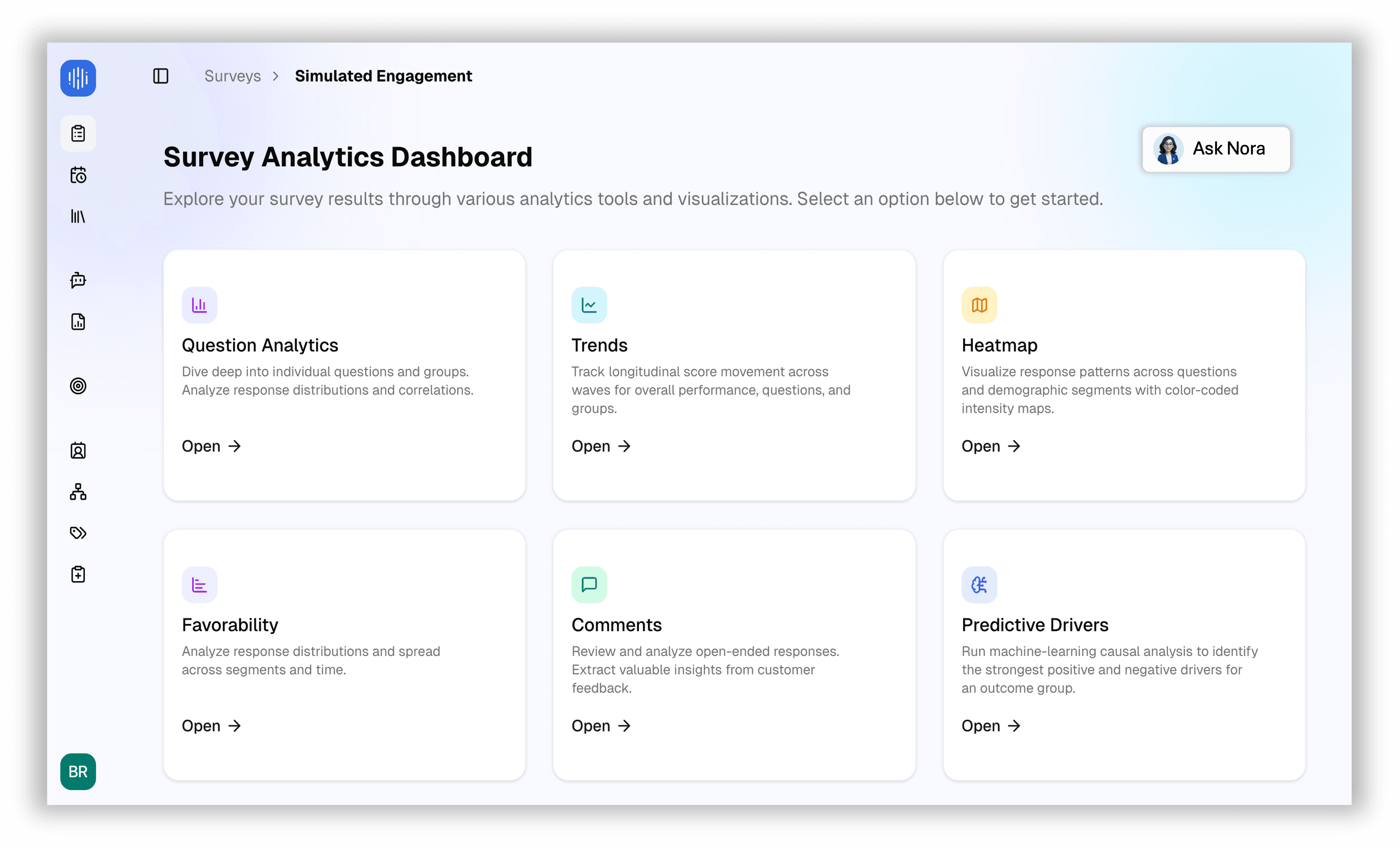 Unify your employee surveys into one platform, utilizing robust logic & conversational AI to uncover deep trends live in the moment.